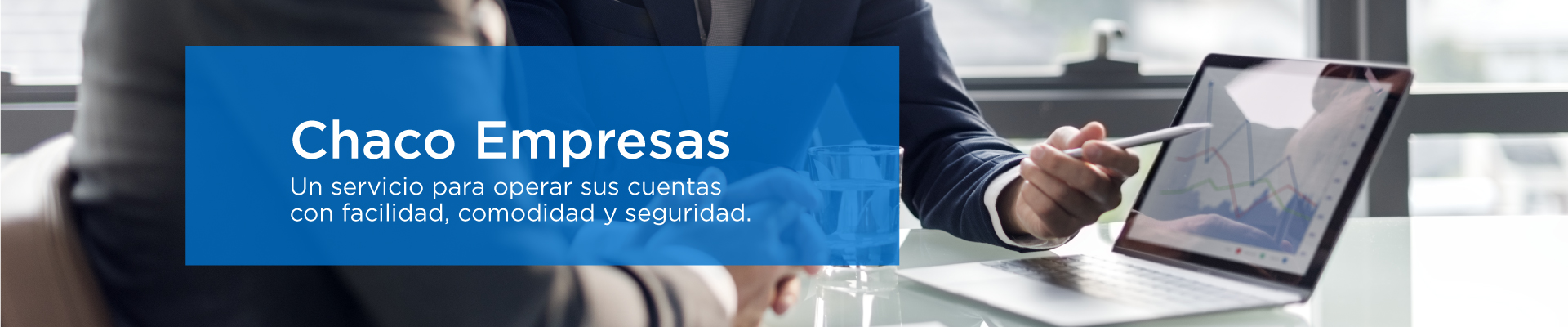 Accedé al Instructivo Nuevo usuario – ingreso por primera vez haciendo Click Aquí Accedé al Instructivo Chaco Empresas 3.0 - Login haciendo Click Aquí Accedé al Instructivo Chaco Empresas 3.0 - Recupero de clave haciendo Click Aquí Accedé al Instructivo Chaco Empresas 3.0 - Recupero de usuario haciendo Click Aquí Accedé al Instructivo Chaco Empresas 3.0 - Alta de token – Segundo Factor de Autenticación haciendo Click Aquí Accedé al Instructivo Chaco Empresas 3.0 - Pago de impuestos y servicios haciendo Click Aquí Accedé al Instructivo Chaco Empresas 3.0 - Transferencias haciendo Click Aquí Accedé al Instructivo Chaco Empresas 3.0 – Transferencias inmediatas con App Token haciendo Click Aquí Accedé al Instructivo Chaco Empresas 3.0 - Funcionalidades APP token haciendo Click Aquí Accedé al Instructivo Chaco Empresas 3.0 - E-Cheq Emisión haciendo Click Aquí Accedé al Instructivo Chaco Empresas 3.0 - E-Cheq Depósito haciendo Click Aquí Accedé al Instructivo Chaco Empresas 3.0 - E-Cheq Negociación haciendo Click Aquí Accedé al Instructivo Chaco Empresas 3.0 - E-Cheq Aval, Solicitud, Aceptación y Rechazo haciendo Click Aquí Accedé al Instructivo Chaco Empresas 3.0 - E-Cheq Endoso, Envío, Aceptación y Rechazo haciendo Click Aquí Accedé al Instructivo Chaco Empresas 3.0 - E-Cheq Cargas Masivas haciendo Click Aquí Accedé al Instructivo Chaco Empresas 3.0 - E-Cheq GENERACION CAC (Certificado de Acciones Civiles) haciendo Click Aquí Accedé al Instructivo Chaco Empresas 3.0 - E-Cheq Solicitud de devolución haciendo Click Aquí Accedé al Instructivo Chaco Empresas 3.0 - Orden Debin haciendo Click Aquí Accedé al Instructivo Chaco Empresas 3.0 - Aceptación de Debin haciendo Click Aquí
