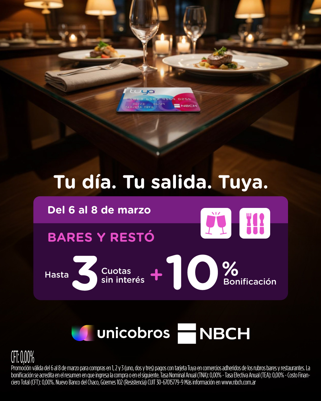 Además, con la promo de Bares y Resto por el mes de la mujer, las clientas de la tarjeta chaqueña tendrán un 10% de bonificación y 3 cuotas sin interés pagando con Tuya en bares y resto adheridos.