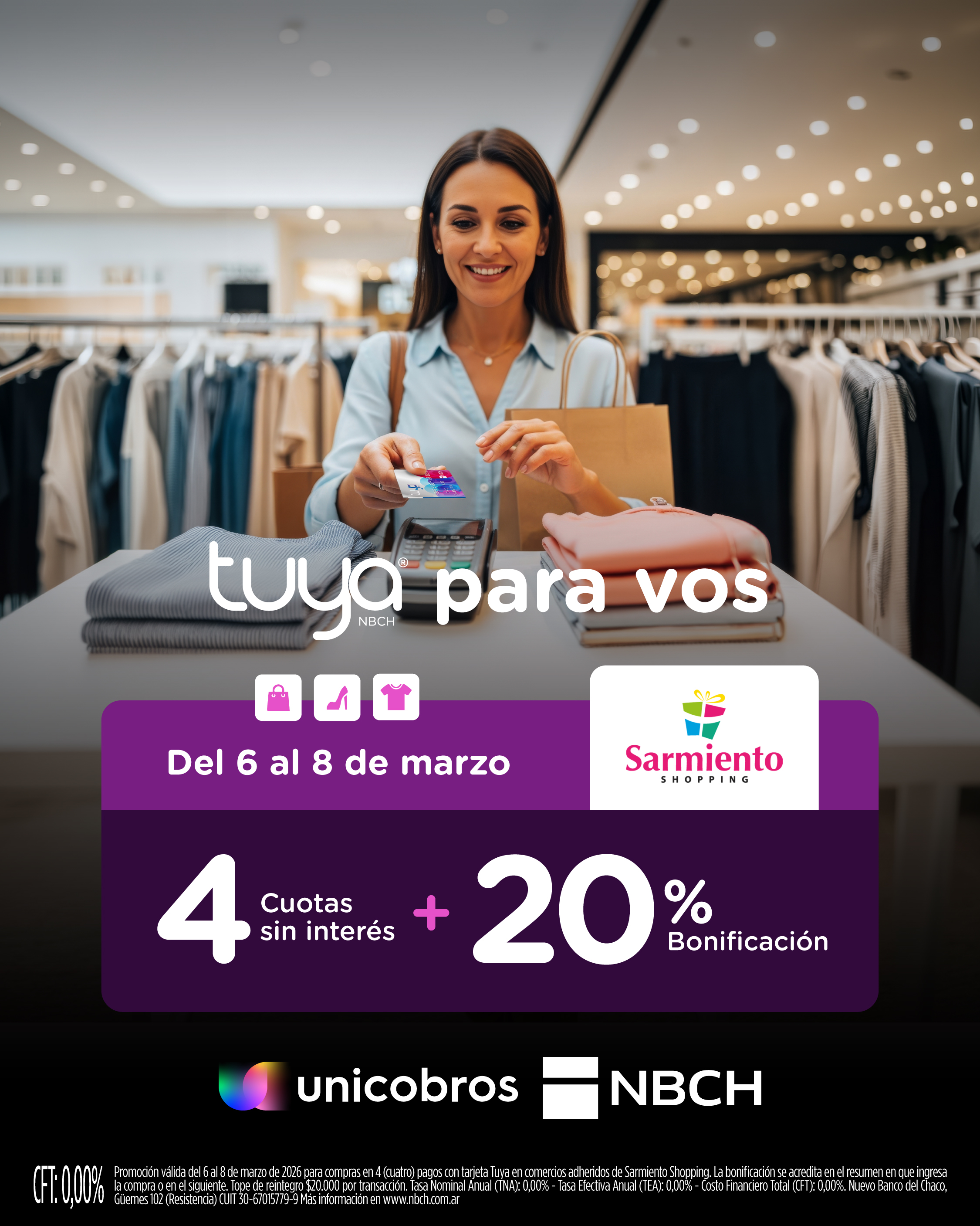 En este marco, Nuevo Banco del Chaco acompaña con una promoción especial para incentivar las ventas, favoreciendo a sus clientas con 20% de bonificación y 4 cuotas sin interés pagando con Tarjeta Tuya en comercios adheridos del Shopping Sarmiento.