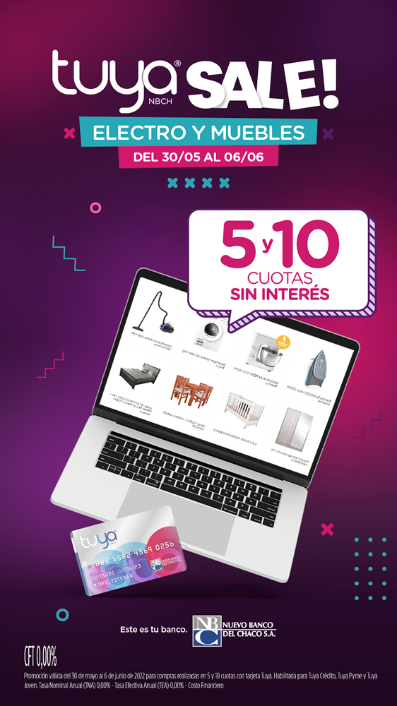 Además, hasta el próximo lunes 6, Tarjeta Tuya se sumó al Hot Sale con 5 y 10 cuotas sin interés en los rubros de artículos del hogar, tecnología y electro. Esta promoción se enmarca en el evento de venta online organizado por la Cámara Argentina de Comercio Electrónico para comprar con descuentos y aprovechar los planes financiación.